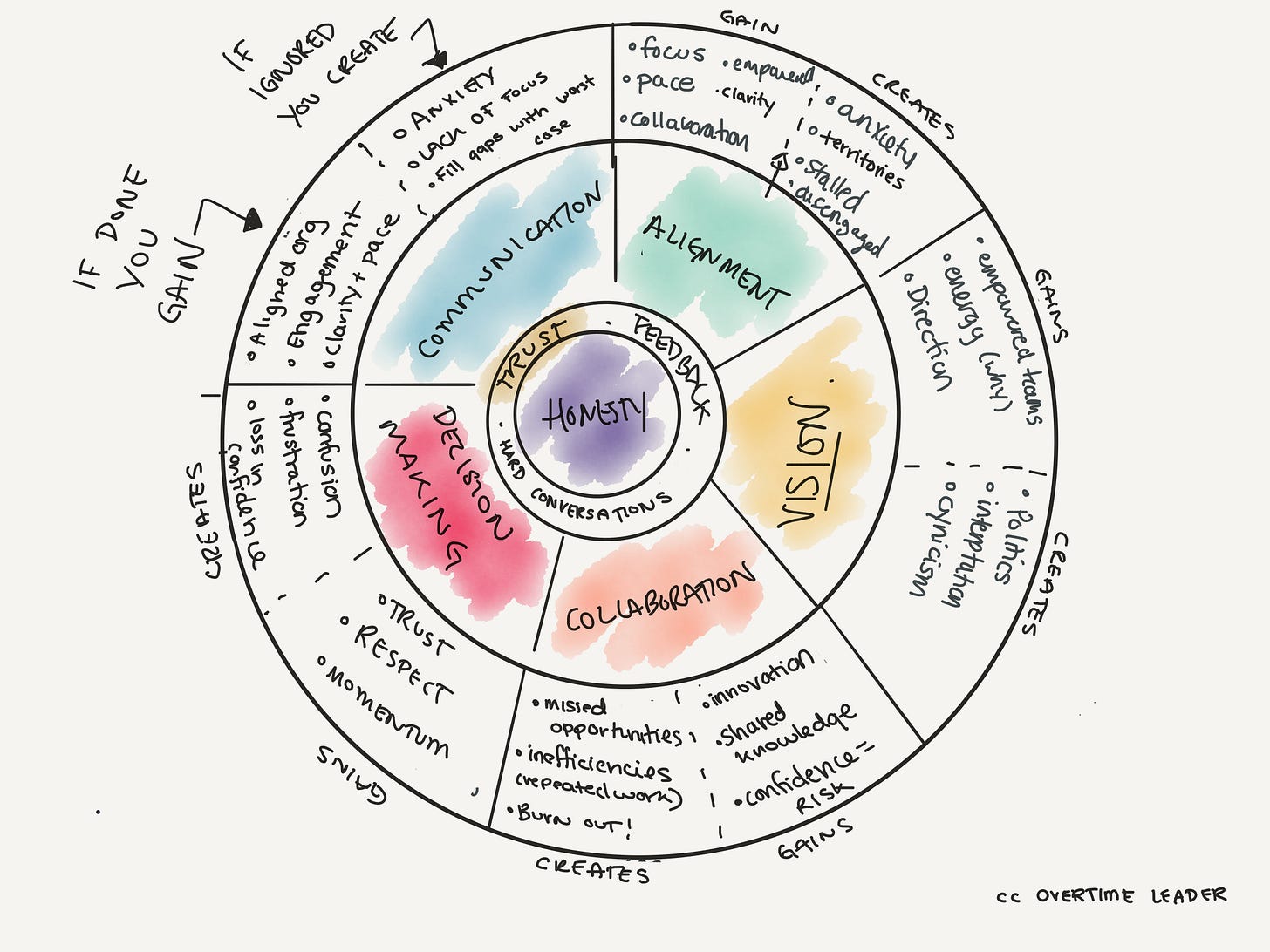 I created this wheel a while back to help contextualise the patterns I was seeing across my clients. It helps me to help leaders connect the small behaviours with the big outcomes: